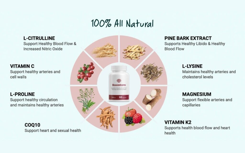 Boostaro features a 100% all-natural formula made from carefully selected ingredients known for their role in supporting healthy blood flow, arterial flexibility, heart health, and male vitality. Each ingredient is included for a specific scientific purpose, working together to support overall circulation and performance.